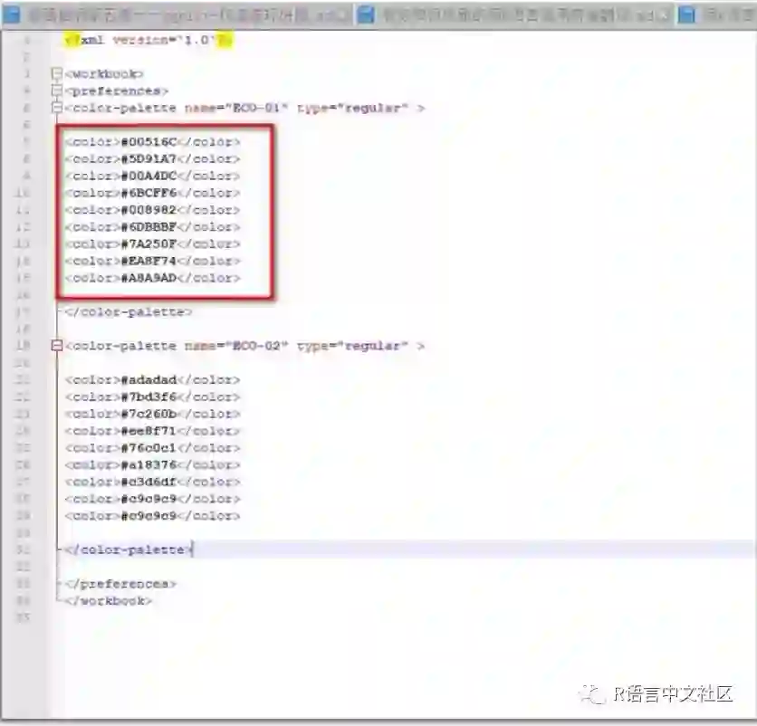 这是一个xml文件(不明白为撒是.tps格式的),里面的所有内容都是基于XML语法,仔细看就会发现,其与刚才我们看到的json主题色板信息差不多,都是由颜色主题名称、序列颜色色值等信息组成的,只是xml语法中的键值对规则与json稍有区别。
