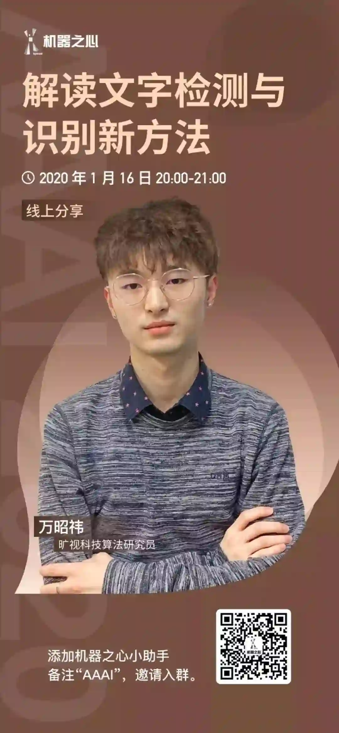 1月16日,新一期AAAI 2020线上分享,我们邀请到了旷视研究院算法研究员万昭祎,为我们介绍他们在论文中提出的高性能实时文字检测算法和更鲁棒的文字识别框架。