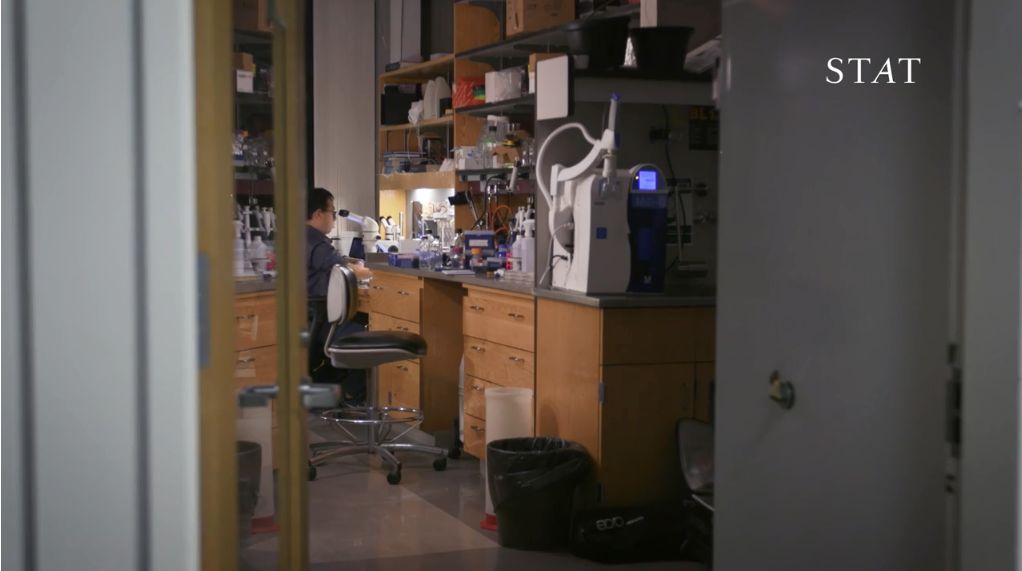 李在霍维茨实验室工作到深夜。 图片来源:Jaclyn Jeffrey-Wilensky/STAT