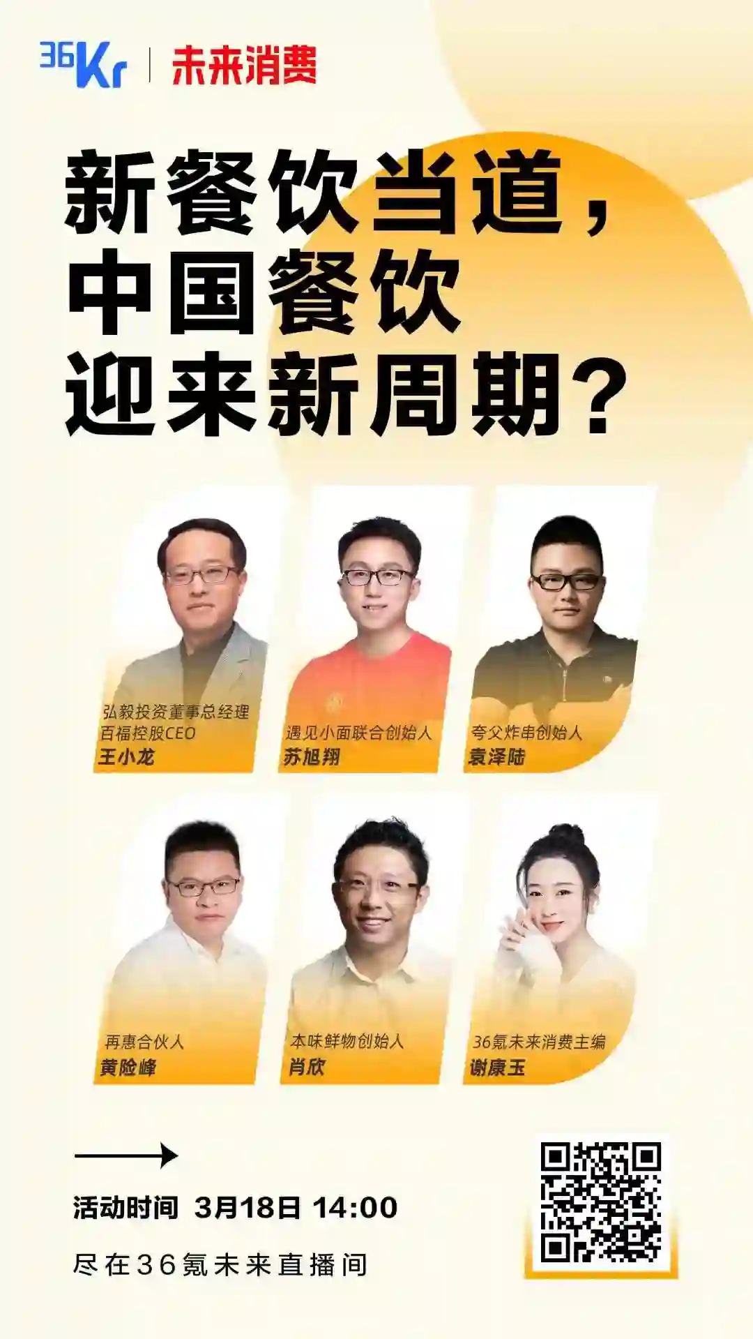 36氪未来消费(微信ID:lslb168)将在3月18日举办新餐饮线上沙龙与5位顶级投资机构高管、新餐饮行业头部玩家共同探讨在流量阵地火热、市场瓜分细微化的趋势下,新餐饮的变化和未来。