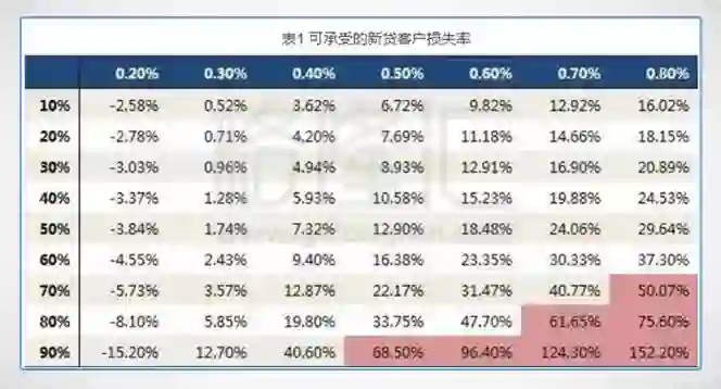 较高的违约风险必然需要较高的利率去覆盖,尽管大数据基本成为现金贷的「标配」。但是到了现金贷这里,真正的护城河是——高利率 (高手续费=变相的高利率)。一位业内人士告诉笔者, 这个行业普遍的坏账率在20%以上,但依然暴利,某家知名的大型平台,最开始的坏账率接近50%,但是每个月还可以挣3千万,基数大,服务费高"在这在逻辑上,躺着也能来钱。下文计算的表格也从盈利模式的角度证明了这一点。在客户结构一定的前提下,利率越高,可承受的新贷客户损失率也会增加。要划重点的一点是,很多互联网金融产品打出日利息率虽然很低,但是高手续费+高服务费,也是一样的完美收割啊。