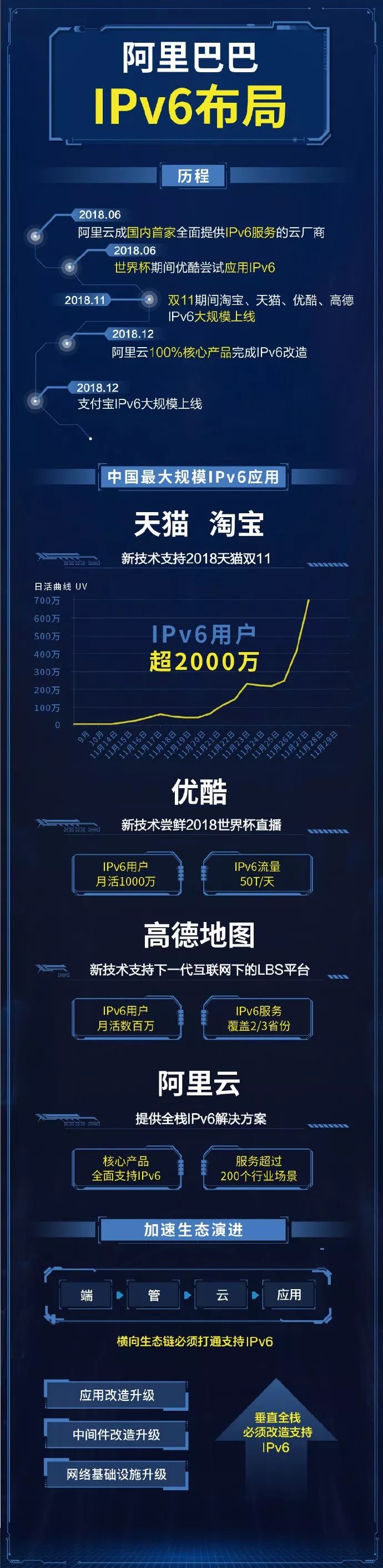 阿里巴巴2017年开始投入IPv6技术的研发与应用,并率先实现了大规模应用。其中,优酷、淘宝、天猫以及高德地图等多个用户量过亿的应用已开花结果,实现了IPv6的落地。现在,所有企业都可以通过阿里云获得这一能力。