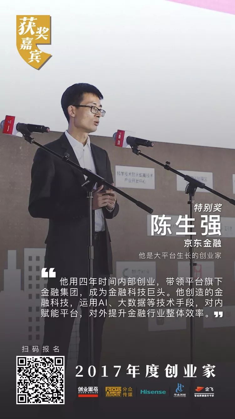 创业家讯 (智晓锋) 12月15日消息,由创业黑马主办、海信冠名的第十届创业家年会今日在京举行。京东金融CEO陈生强获得金融科技行业“年度创业家特别奖” 。