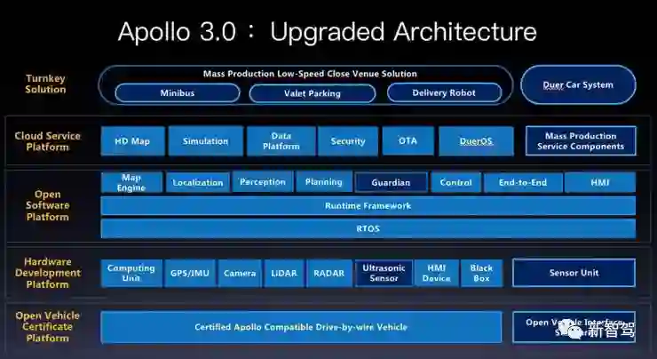 2 大新平台则是 Apollo 3.0 更新中非常重要的部分,包括此前的硬件参考平台升级为现在的硬件开发平台;此前的车辆参考平台升级为现在的车辆认证平台。