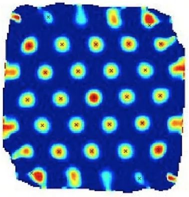 2005年,Moser夫妇发现了大脑内嗅皮层更为神奇的网格细胞。他们记录大鼠运动时特定神经细胞被相应激活的规律,发现如上的图像,其中黑线是运动轨迹,而红点则是在该位置相应细胞被激活的记录。统计去噪后,模式是这样的,呈现规律的六方排列!