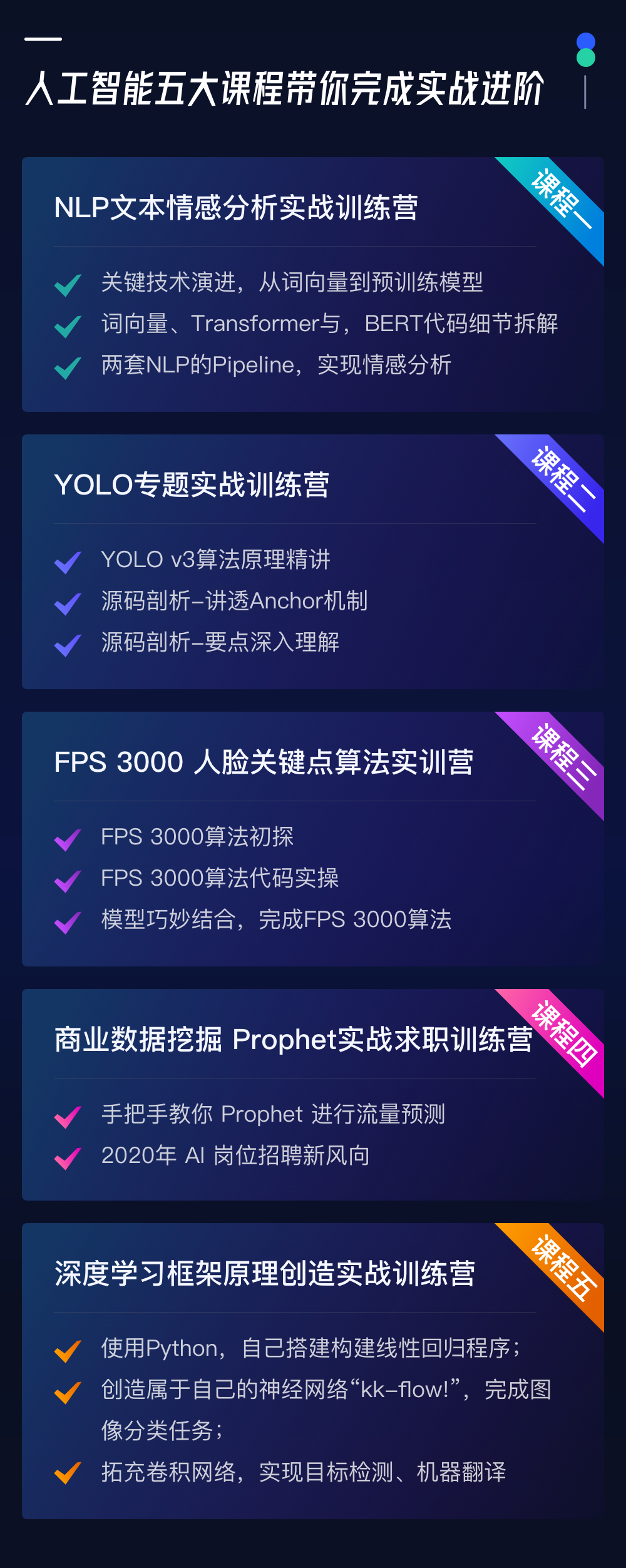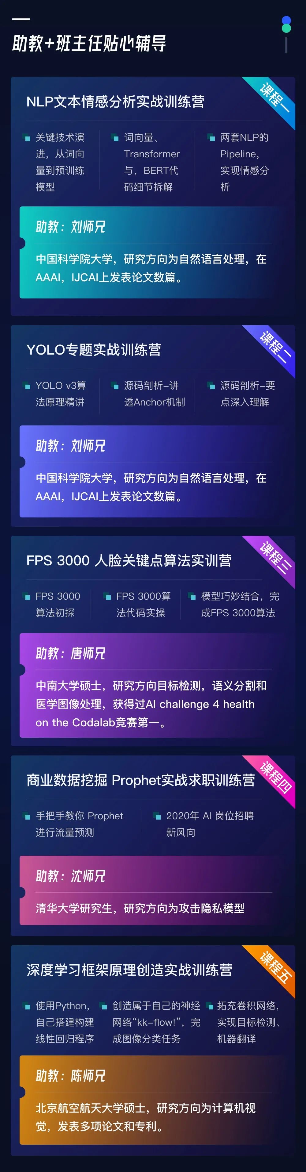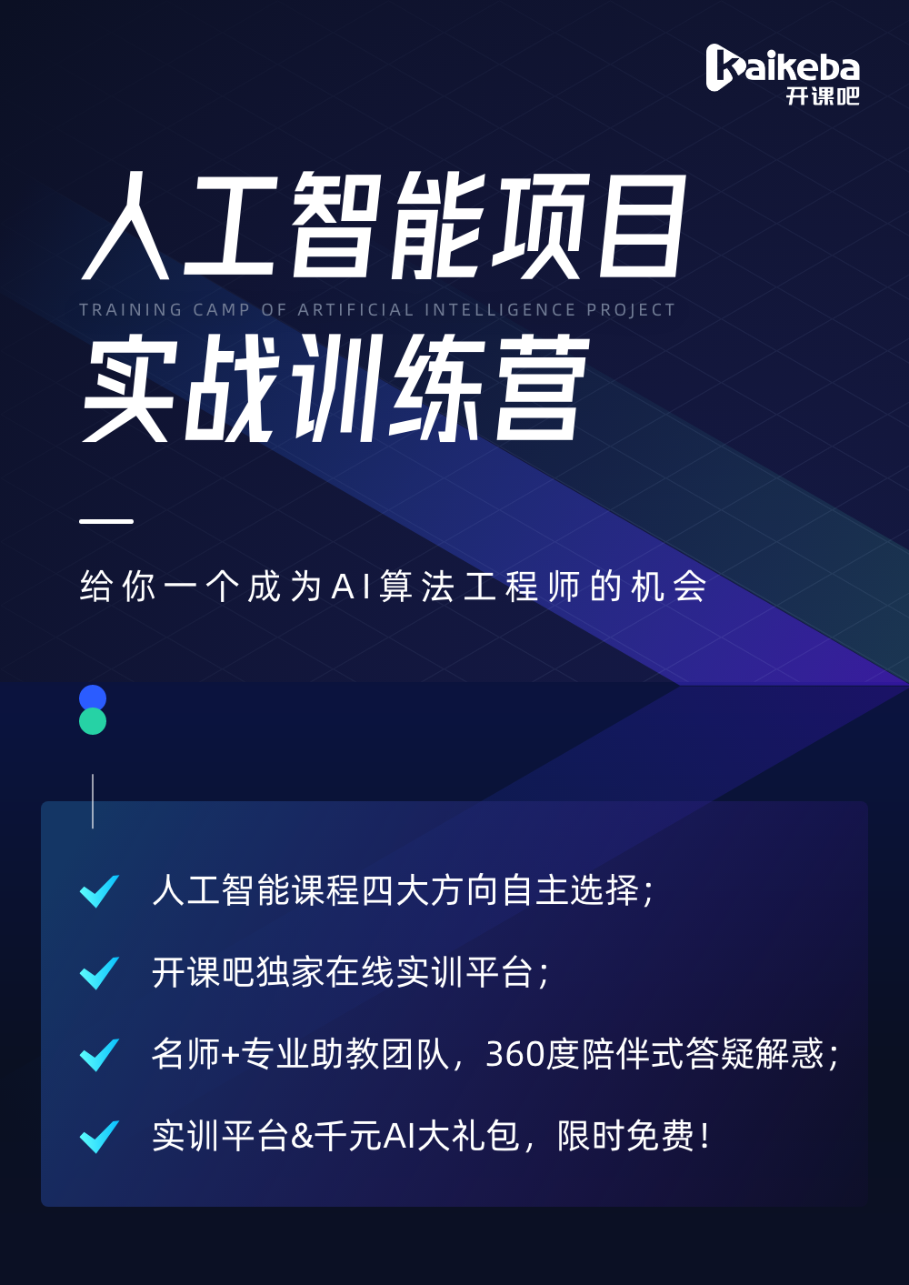 在总结了不少学员的急迫需求之后,开课吧人工智能学院特此开展《人工智能项目实战训练营》,开设多个方向课程,帮你找到准确定位。与此同时,独家实训平台+助教陪伴式学习也帮你解决学习上软硬件的各种问题,360度无死角为你的安心学习铺平道路!