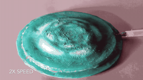 如下图,研究人员制作了灰色的硅胶片,然后切割网状物,硅胶膨胀后就形成了岩石状的物体。他们还制成了一个绿色的环状物,最终的成品就是类似圆白菜的形状。未来,这种伪装皮肤可能被用于将机器人隐形,用来监视野生动物,或被用于军事伪装。