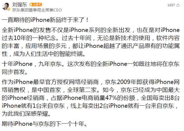 刘强东发文称,全新iPhone的发售不仅是iPhone系列的全新出发,也是对iPhone过去10年的一种纪念。当然,重点是:十年iPhone,九年京东。这次发布的全新iPhone一如既往地将在京东同步首发。