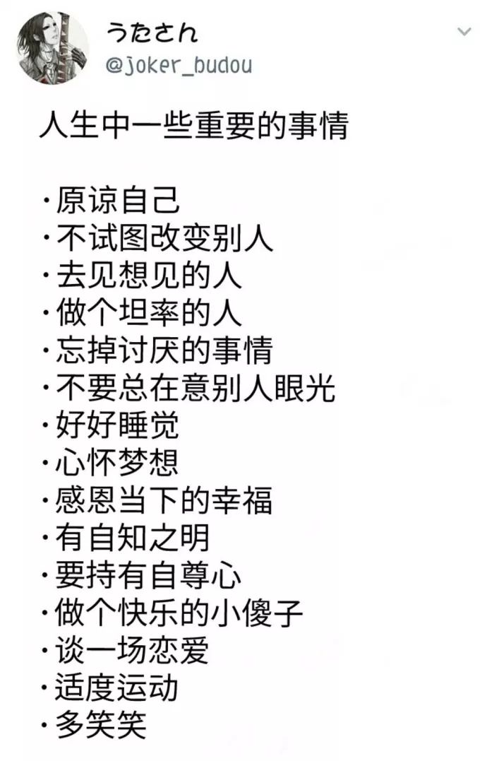 日推网友joker_budou总结的“人生中一些重要的事情”,像倒数第四项那样做个开开心心的沙雕网友也很幸福了啊