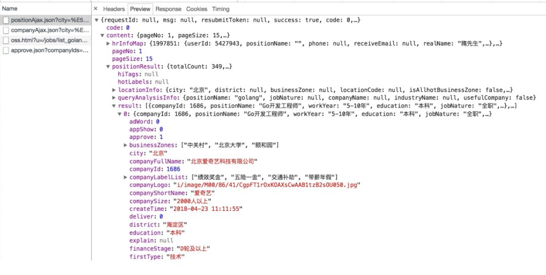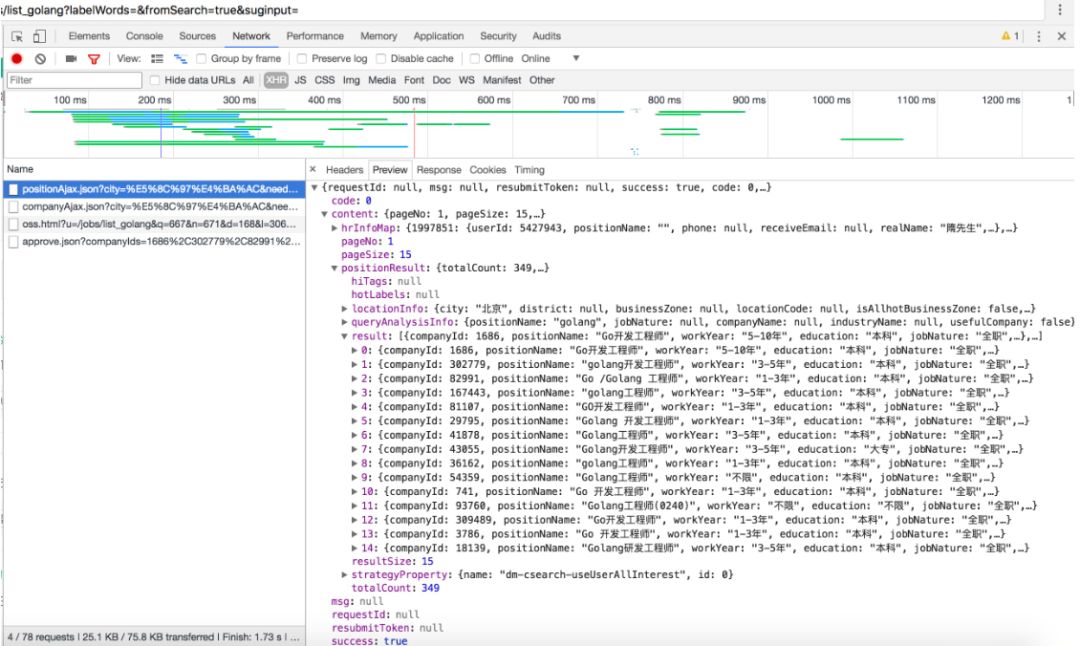 搜索 golang 关键字,打开页面 F12 就能看到它发送了四个请求,留意 positionAjax.json 这个请求: