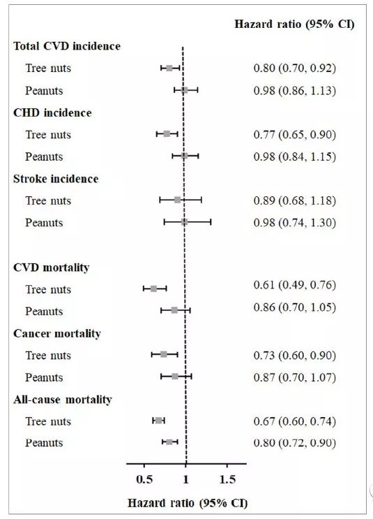 在这项新研究中,研究人员分析了16217名男性和女性在被诊断为2型糖尿病之前和之后自我报告的饮食调查问卷,并询问他们在几年时间内对花生和树坚果的食用情况。在随访期间,总共发生了心血管疾病3336例(其中冠心病2567例,中风769例),死亡5682例(其中心血管疾病1663例,癌症1297例)。