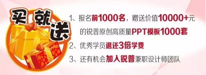 3、福利超值:报名即可获得1000套原创高质量模板+优秀学员退还3倍学费+有机会加入锐普设计团队,老师还会不定期线上直播答疑,零距离接近PPT大神!