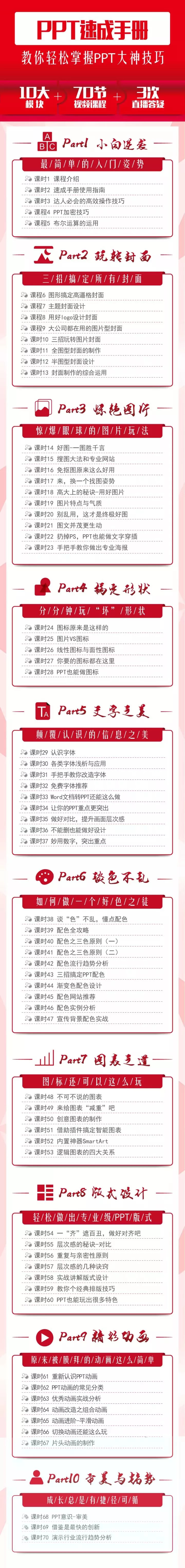 1、内容超丰富:从0到1,图片、文字、形状、配色、图表、版式、动画样样精通,更多小技巧,即使不跟着练,听一遍也让你收获满满!