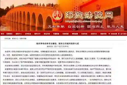 【TechWeb报道】12月7日消息,根据海淀法院官网消息,未成年人李先生租赁共享电动自行车出事故,车辆经鉴定为机动车,在赔偿受害人损失 后,李先生将租车公司诉至法院要求赔偿相关损失。日前,海淀法院审结了此案。法院判决租车公司对李先生的损失承担七成的赔偿责任。
