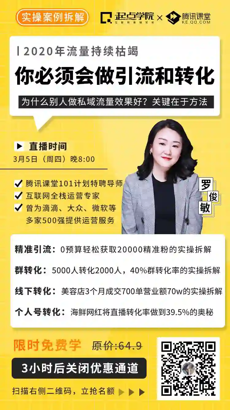 这里给大家推荐一个免费的引流和转化公开课,授课导师将拆解自己的操盘案例,分享引流和转化方法,希望能启发你的思维,对你有所帮助。