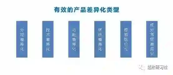 接下来,我们主要介绍如下几个有效的产品差异化类型:外观差异化、技术差异化、功能差异化、体验差异化、极致性价比和细分市场差异化。这些差异化并不是彼此孤立的,而是相互关联、相互影响的,必须进行综合分析和权衡。