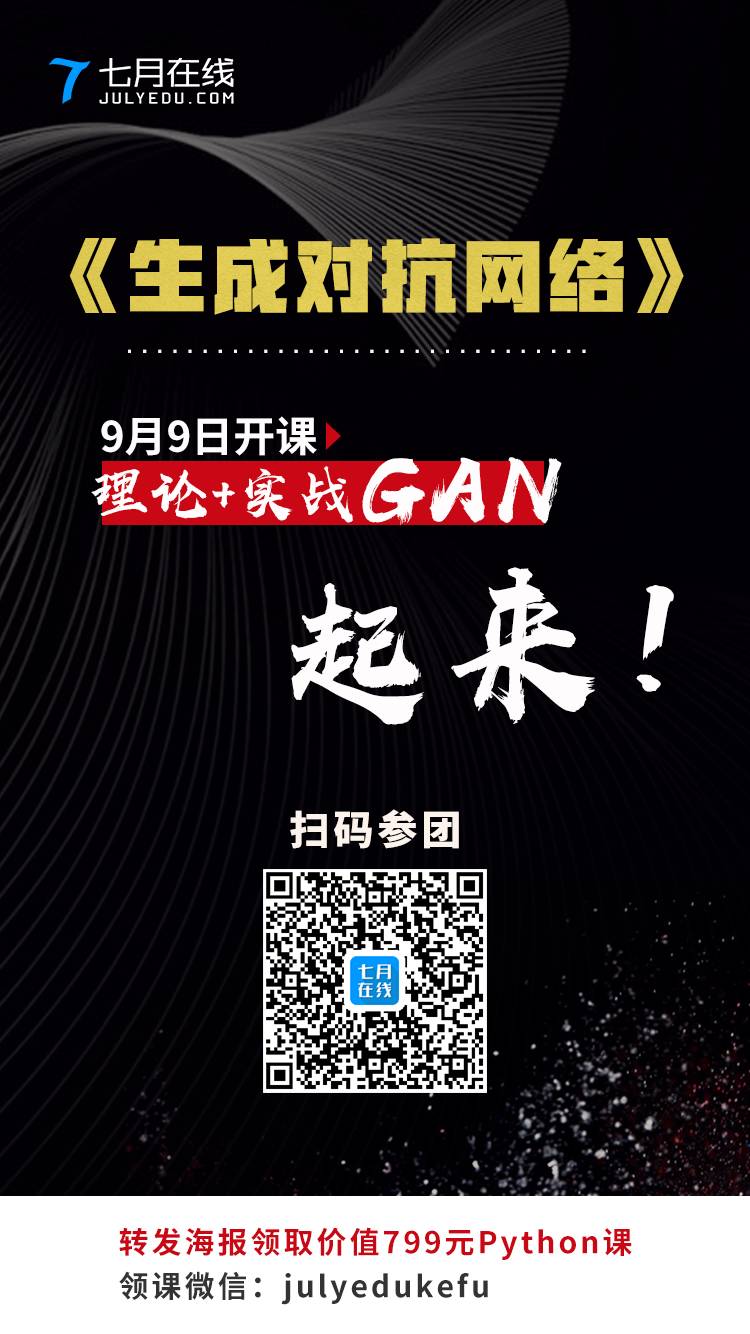 在这篇文章中,我们解释了生成式对抗模型,并讲解了一些实用技巧。原文中还有一些实现GAN的资料,在七月在线微信公众号(ID:julyedulab)对话界面回复“实现”两个字,可以获得这份学习资源大礼包。