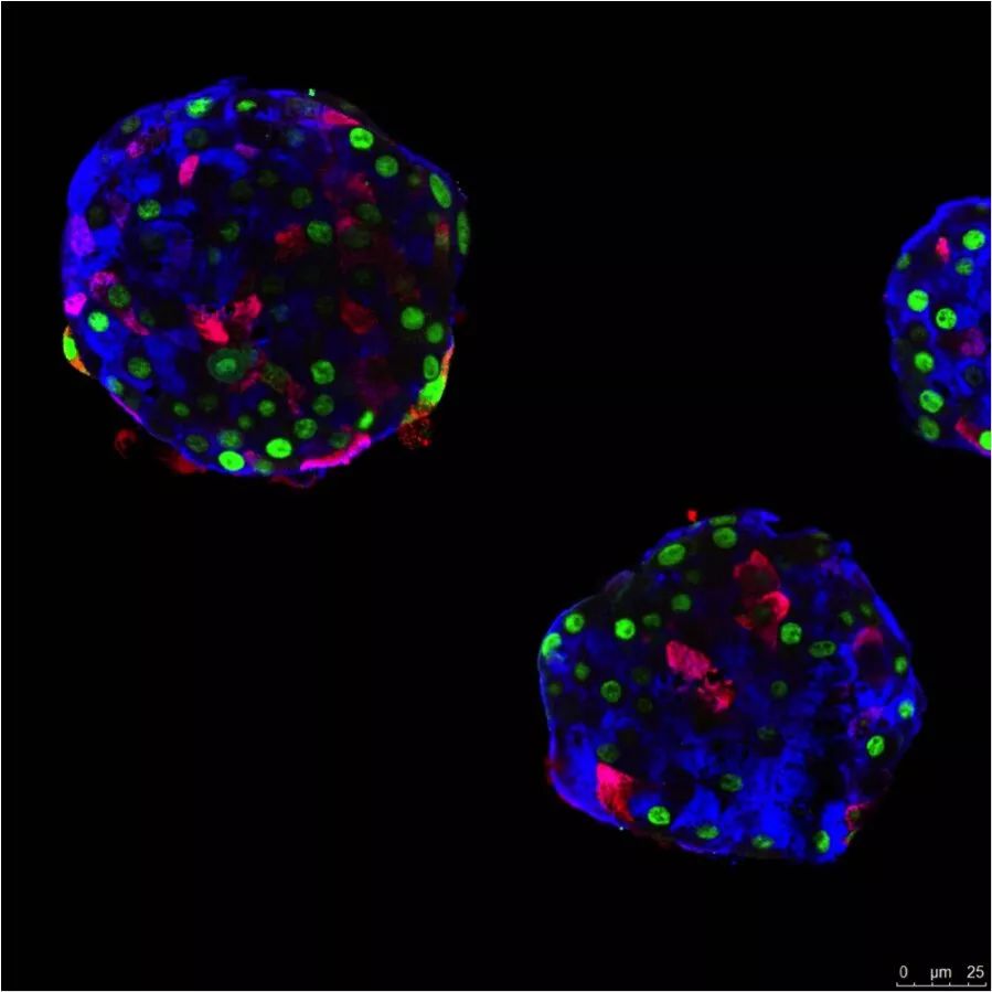 由α细胞构成的假胰岛。这些细胞原本负责产生胰高血糖素(蓝色),但是可以“学习”智造胰岛素(红色)。绿色是GFP蛋白,用于追踪细胞来源,从而证明细胞的身份改变。(图片来源:UNIGE的Pedro Herrera)