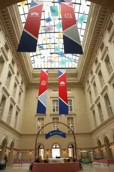 道路两旁装饰着法国国旗色为主色调的道旗,仔细看看,旗上还镶嵌着华为logo和徽章,据说是设计师为巴黎组团设计的。一个同事脱口而出:怎么感觉像国际学校的入学仪式?喂,所以你是觉得到了霍格沃茨?