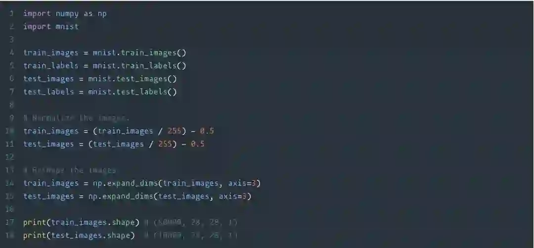 在开始之前,我们将把图像像素值从 [0,255] 规范化为 [-0.5,0.5] 以使网络更容易训练(使用较小的中心值通常会得到更好的结果)。我们还将把每个图像从(28,28)改为(28,28,1),因为 Keras 需要第三维度。
