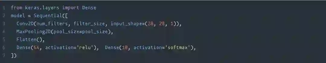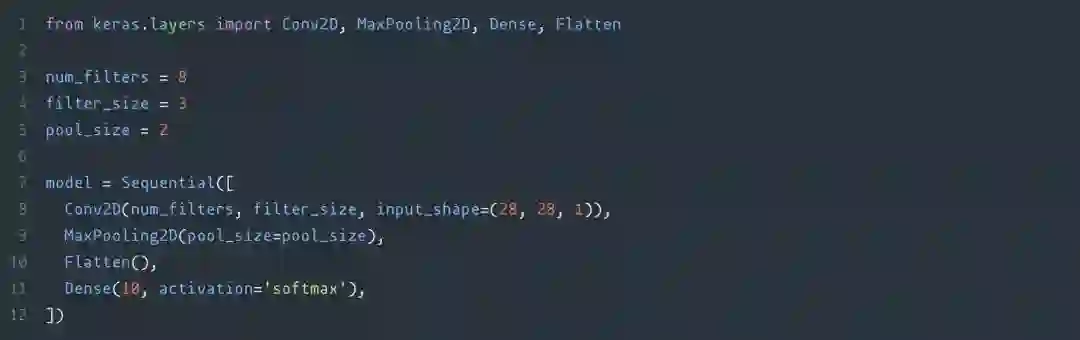 Sequential 构造函数接受一个 Keras Layers 数组。我们将为 CNN 使用三种类型的层:卷积层、最大池层和 Softmax 层。