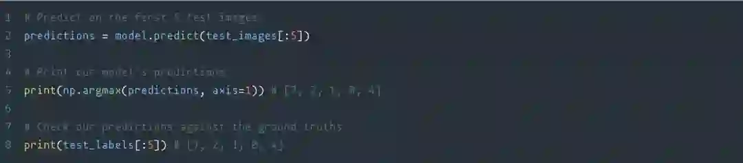 使用经过训练的模型进行预测很容易:我们将输入数组传递给 predict(),它返回一个输出数组。请记住,我们网络的输出是 10 个概率(因为 softmax),所以我们将使用 np.argmax() 将这些转换为实际数字。