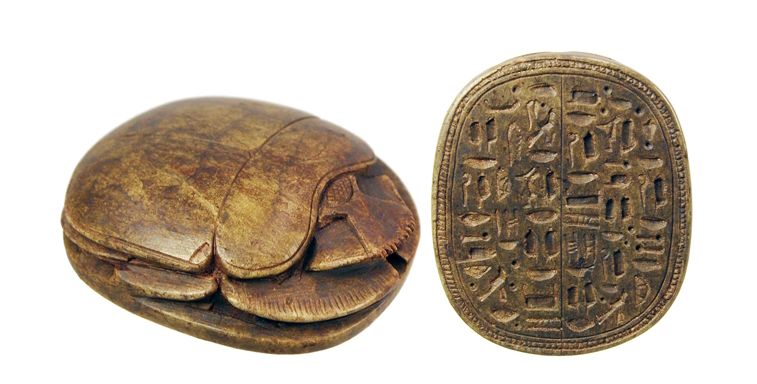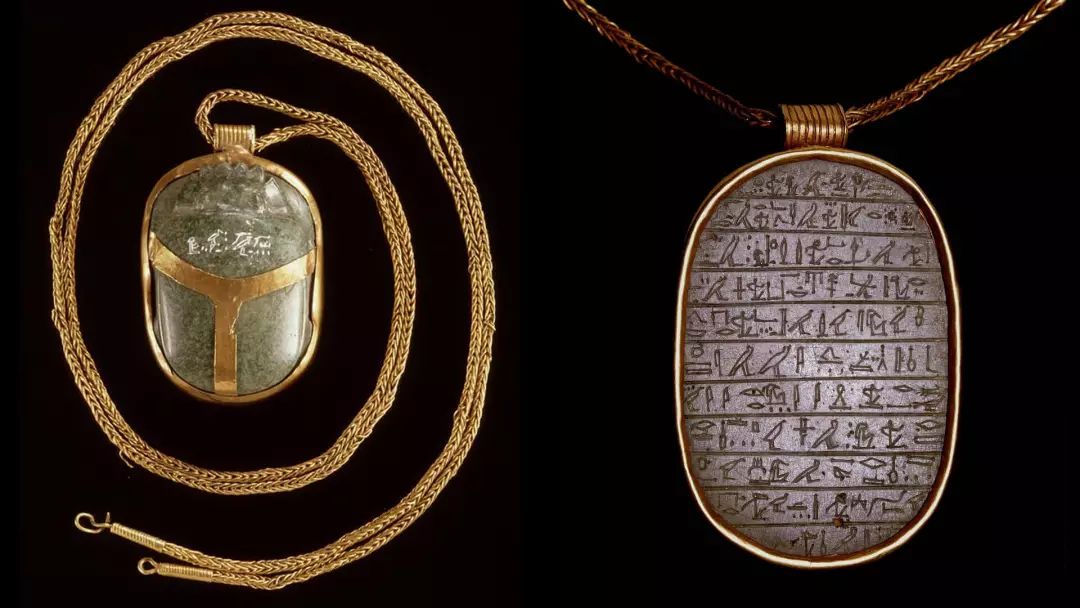 给死者佩戴的心形圣甲虫饰品,一面刻有象形文字 | NationalArchaeological Museum at Leiden,Holland