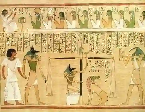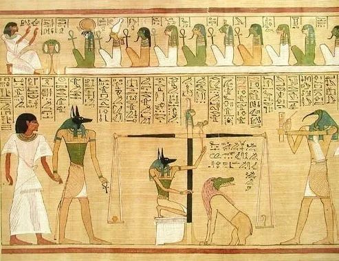 阿努比斯有特制的秤,秤的一边放着“正义之神”玛阿特(Ma'at)的羽毛,另一边则放上死者的心脏。若心脏重量轻于羽毛,便可以升到天堂,与众神一样得到永生;若心脏重于羽毛,说明罪孽深重,魂灵将被扔给怪兽阿米特(Ammit)吃掉。