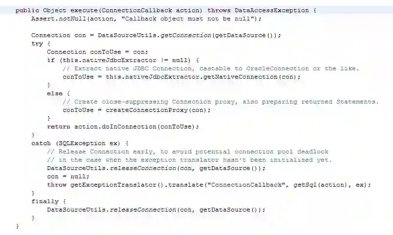 Template Method模式一般是需要继承的。这里想要探讨另一种对Template Method的理解。spring中的JdbcTemplate,在用这个类时并不想去继承这个类,因为这个类的方法太多,但是我们还是想用到JdbcTemplate已有的稳定的、公用的数据库连接,那么我们怎么办呢?我们可以把变化的东西抽出来作为一个参数传入JdbcTemplate的方法中。但是变化的东西是一段代码,而且这段代码会用到JdbcTemplate中的变量。怎么办?那我们就用回调对象吧。在这个回调对象中定义一个操纵JdbcTemplate中变量的方法,我们去实现这个方法,就把变化的东西集中到这里了。然后我们再传入这个回调对象到JdbcTemplate,从而完成了调用。这可能是Template Method不需要继承的另一种实现方式。