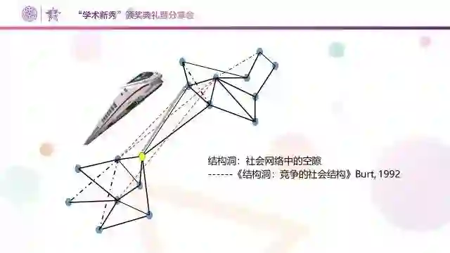 高速铁路的开通,会影响创业企业和投资者的地理分布,也会影响投资网络的结构。比如,图示两个城市中的企业集群,中间黄色的点,代表某一类特殊企业,因为他们占据了结构洞,其他企业必须要通过他才能和另一个城市的企业建立联系,也就是起到桥连接的作用。这里企业是具有独占性信息优势的。但是高速铁路联通这两个城市后,更多的跨城市投资形成,原来的结构洞所代表的独占性信息优势减弱。这也就是我的论文的主要贡献之一,提出了动态情境下的社会资本理论。