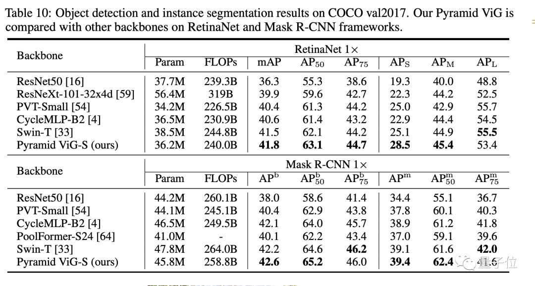 在目标检测和实例分割测试上,ViG表现也与同等规模的Swin Transformer相当。