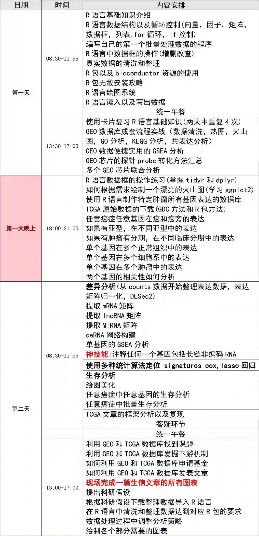 本次我们有幸邀请到具有丰富经验的老师进行两天一晚的高强度实操训练,目标是让大家一次学习不再报班。作为临床科研工作者,深知无课题之苦,因此愿将所学知识和盘托出,没有隐藏。网上超过1万个免费的生信帖子来源于他们,致力于给非生信专业人员普及生物信息学,擅长各种组学的处理,且讲课诙谐幽默。