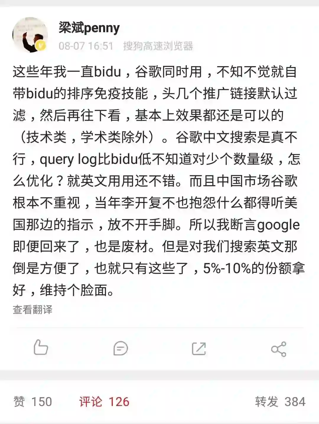 不过,对于百度来说,这份压力或许是一件好事儿,大 V 龙星镖局认为:首先肯定是欢迎谷歌回归中国,服务中国用户。不过,目前我只看到要回归的消息,但具体什么时候回归,哪些产品回归,以什么样的方式回归都还没有定论。但我始终认为抛开政治因素,谷歌迟早会重新捡起中国市场的,因为这里的商业利益太大了。