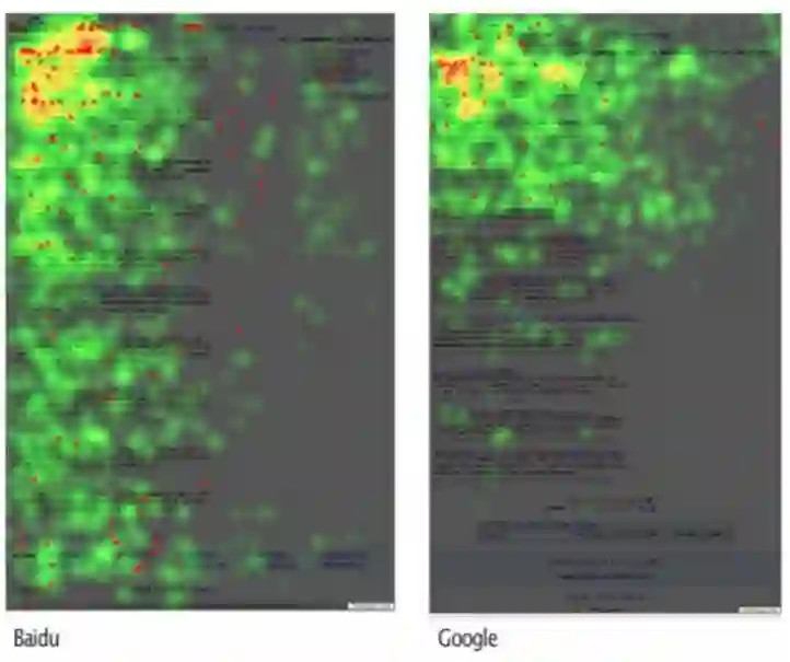 上图是 2007 年有人做过的百度和谷歌用户眼球追踪的对比图。简单来说,图上绿色的点就是用户眼球浏览的记录,从上图能够看出:百度用户虽然很高的几率下能够在第一条结果就得到自己想要的答案,但是浏览整个页面的概率远高于谷歌。
