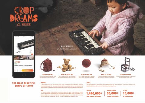 在农村每年约有25%的农作物卖不出去。农村淘宝团队通过“作物梦”的创意表现形式,与艺术家合作,将农产品组合成代表孩子梦想的物品,通过淘乡甜电商平台达成售卖,帮助农村孩子们实现梦想。