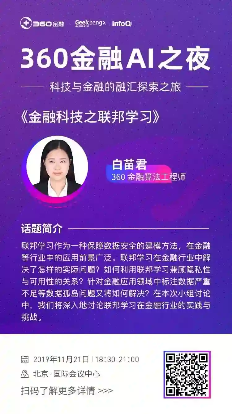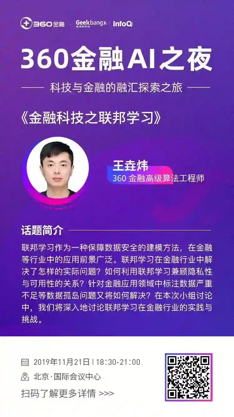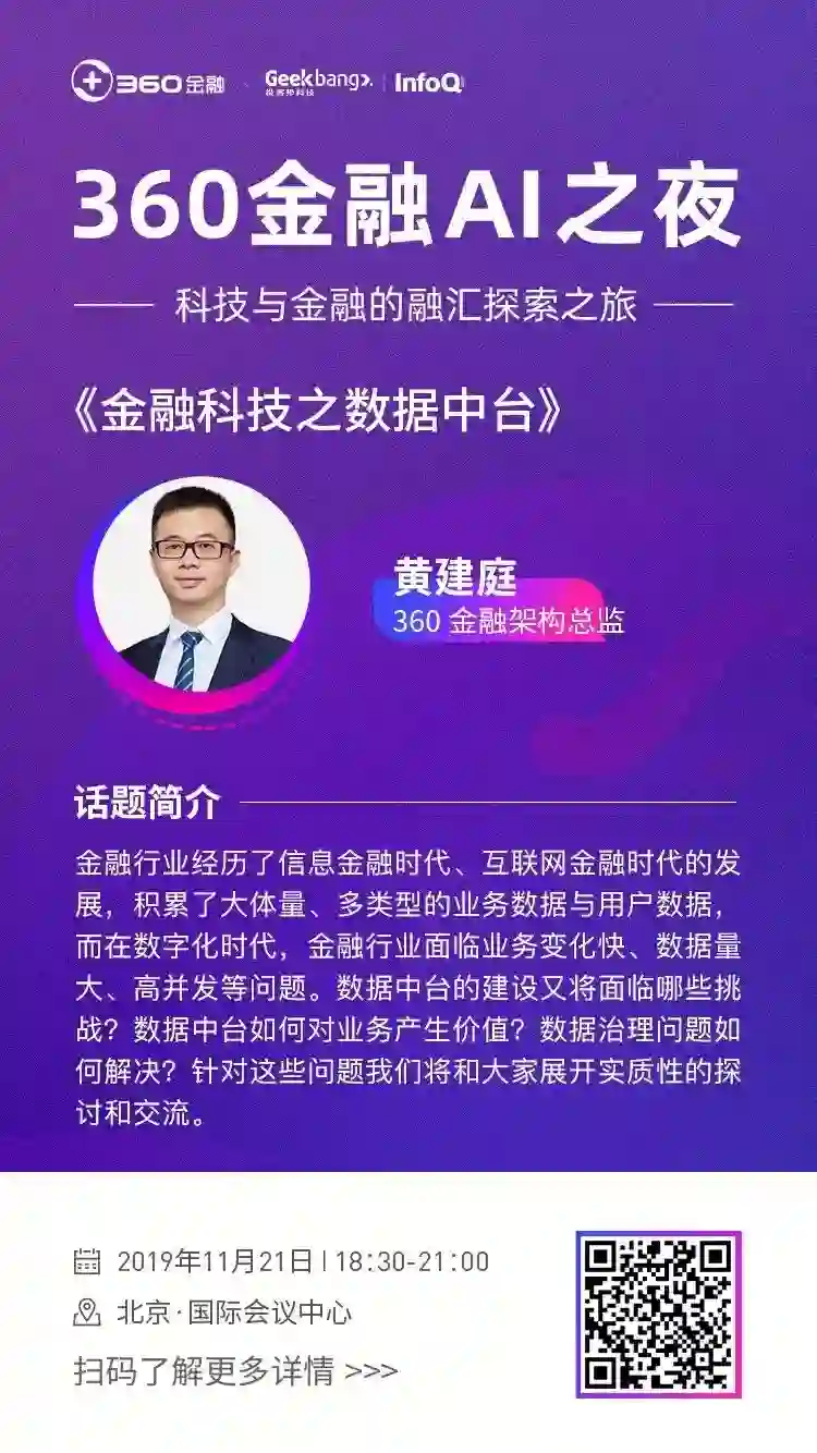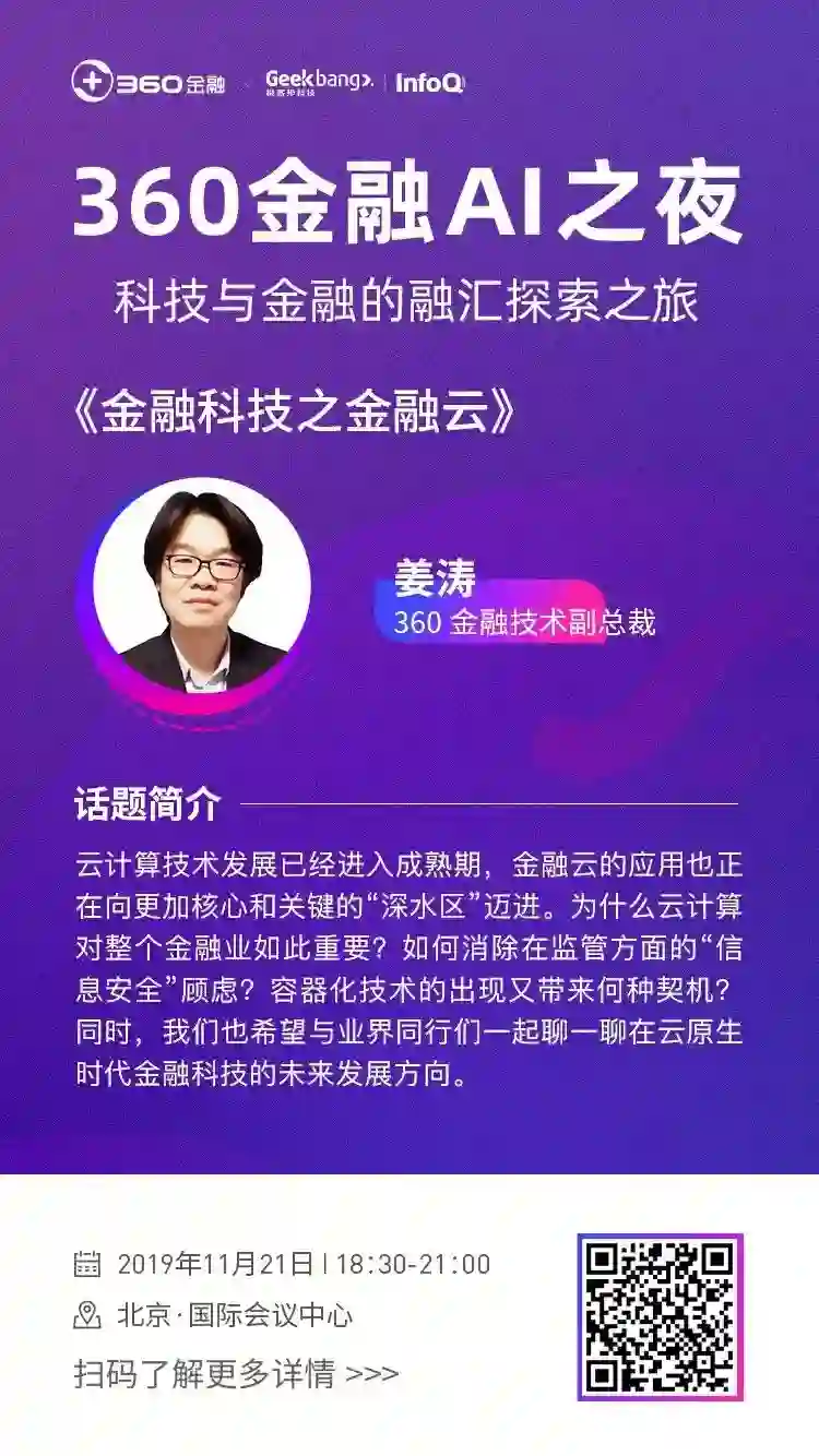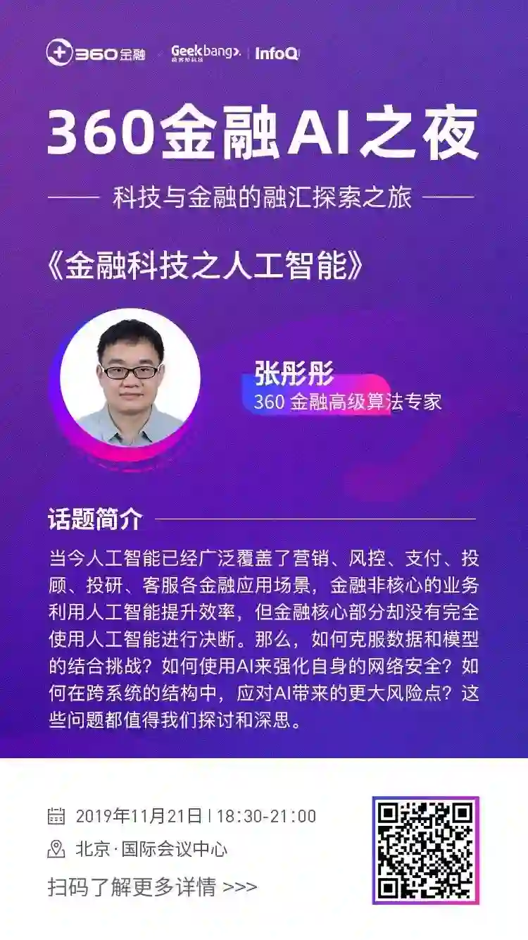 11 月 21 日北京,360 金融的诸位专家联手 InfoQ ,在 AICon 北京 2019 举办“360 金融 AI 之夜:科技与金融的融汇探索之旅”晚场活动,邀请了来自人工智能、数据中台、区块链、金融云等领域的 6 位技术专家,与参会者共同讨论金融科技技术领域的难点与解决思路。