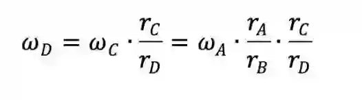 再让第三个半径为rC的齿轮和B同轴转动,所以C和B的转速相等 。最后,再让第四个半径为rD的齿轮D和齿轮C啮合,齿轮D的转速也就可以计算出来了: