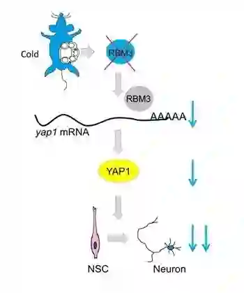 近期,中国科学院动物研究所焦建伟研究团队发现母体低体温与胎儿大脑皮层的发育密切相关。在诱导孕鼠低体温后,胎鼠大脑皮层内神经干细胞增殖比例增加,而分化的神经元的比例减少,并且会促进胎鼠大脑内一种冷激活蛋白——RBM3的表达量增加。此前已有报道称,RBM3参与保护大脑神经元的可塑性,调控生物体昼夜节律过程中的转录活动,参与体内温度相关的转录活动的调节等。为了进一步研究母体低体温状态下RBM3和胎儿大脑皮层发育的关系,研究人员通过特异性敲降胎鼠大脑神经干细胞内的RBM3来研究其功能。结果发现在敲降了RBM3之后,诱导母体低体温会抑制胎鼠神经干细胞的增殖和分化,神经元的发育也会受到影响,但是在正常温度的母体环境下不会引起这种表型。进一步的研究表明,在母体低体温状态下,RBM3会通过调控YAP1这种转录因子辅因子的mRNA的稳定性。以往的报道表明,YAP1蛋白会受到多种因素的调控,比如细胞内能量状态、细胞受到的机械力、细胞生长的密度等都会影响YAP1的生物活性,进而调控细胞或者组织的生长。