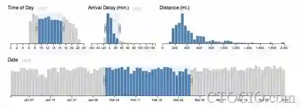Crossfilter应用:当你调整一个图表中的输入范围时,其他关联图表的数据也会随之改变。