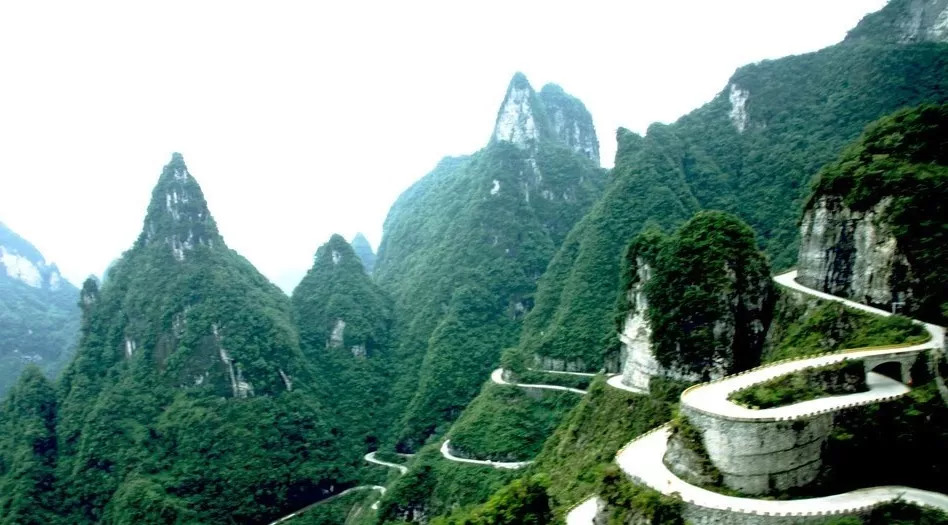 最后一句话,这幅照片是我在天门山拍的一张照片,这张照片中的道路曲折环绕,最后到达了天门山山顶。