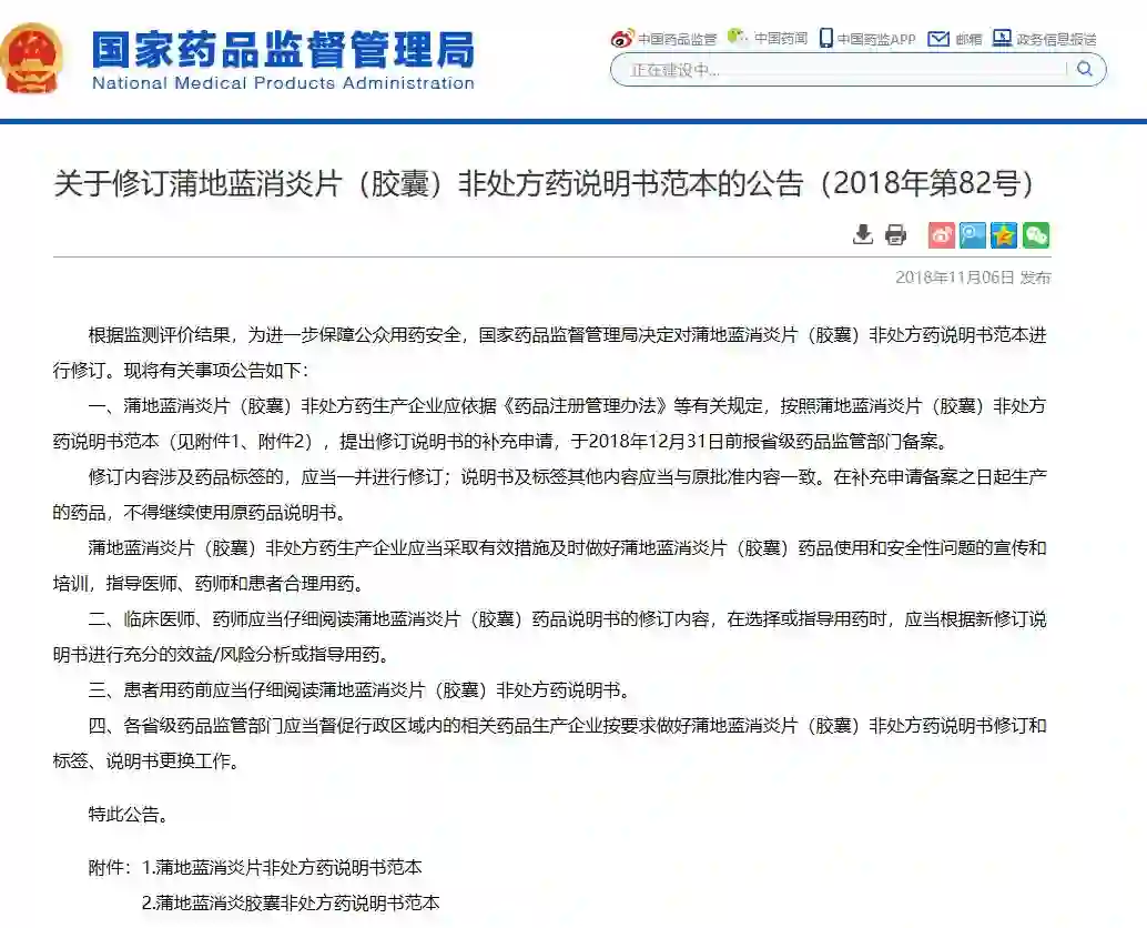 11月6日,国家药监局发布《关于修订蒲地蓝消炎片(胶囊)非处方药说明书范本的公告(2018年第82号)》(以下简称《第82号公告》)。