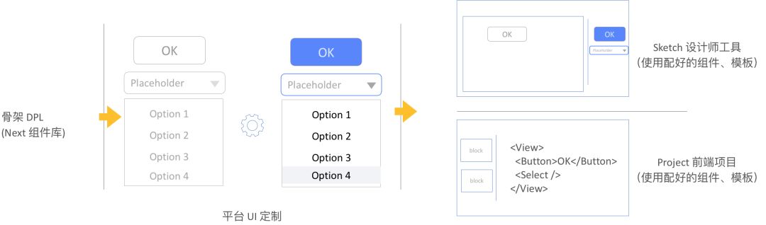 通过抽象骨架 DPL -> 通过平台定制产出定制好 UI 的组件、模板 -> 流入设计师的工具里面直接拖拽使用 -> 前端直接使用定制好的组件(不需关注组件 UI)