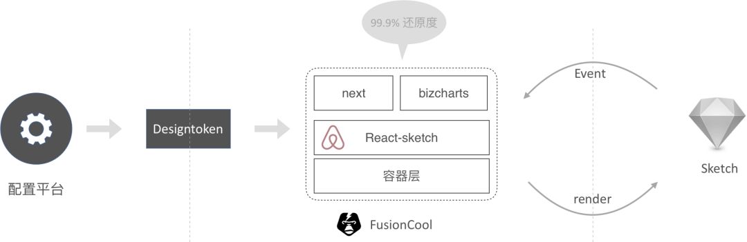从配置平台导出的不再是 html,而是 DesignToken (设计变量),FusionCool 底层使用 Airbnb 提供的 react-sketch 能力写成的一份 Next 组件,直接通过 DesignToken 覆盖默认变量,最终在 Sketch 端实时渲染。