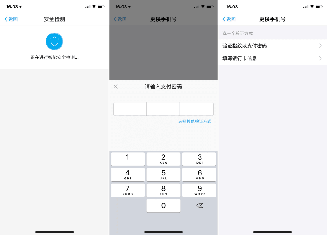为了验证安全性,我又用朋友的手机做了一次试验。选择更换为她的号码,然后填入她接收到的验证码,接下来的“智能检测”就没有通过,页面跳出了输入支付密码的要求。如果把它叉掉,可以看到“验证指纹或支付密码”或“填写银行卡信息”两种验证方式。(所以你家到底什么时候支持Face ID)