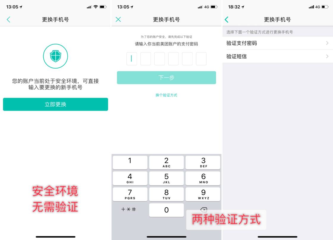 美团App 在进入更换号码的页面之前也有一个安全环境检测的界面。在我这里,连接WiFi 的时候就被判定为环境安全,而使用蜂窝数据的时候就被认为不安全,此时需要输入支付密码,或者可更换为使用短信验证。但我的校园WiFi 又是被iOS 建议为安全性较低的,真是不知道谁说得对。验证后输入新的手机号码并接收验证码换绑就完成了。