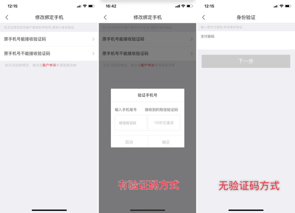 淘宝之后,我们来到另一家网购平台。京东的换绑在设置 - 账户安全中,点击”手机验证“后选择原手机能否接收验证码,如果可以输入验证码即可;选择不能接收验证码会进入输入“支付密码”的界面。同样你也可以选择下方的申诉功能。