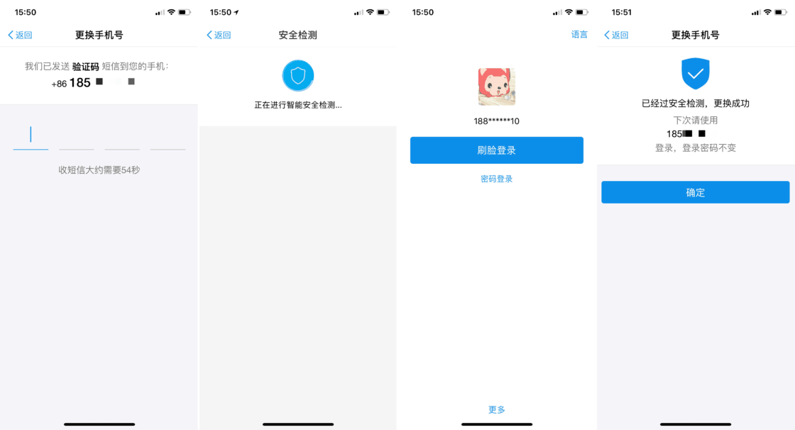 作为日常支付手段之一,牵涉财务的支付宝也不要忘记换绑。进入设置中更换手机号码的界面,首先依然在更改电话号码的界面输入新的号码,然后填入收到的验证码,这时支付宝跳出了一个“正在进行智能检测”的页面,检测通过的话无需任何其他认证即可继续换绑。