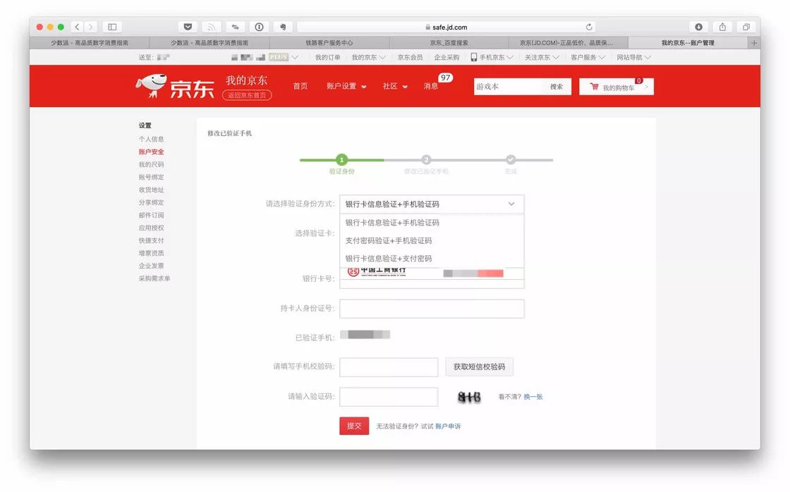 不过即使你的手机不在身边、或是忘记了支付密码,你也可以进入网页版进行更改。京东网页版提供了一个“三选二”的验证方式,你可以在手机验证码、支付密码、银行卡信息之间选择两个,颇有些两步验证的感觉。