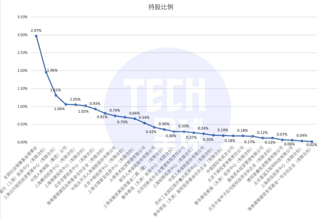 据Tech星球(微信ID:tech618)统计,29家投资股东中,目前有6家投资股东持股比例超过1%,分别是全国社保基金、上海置付、上海众付、中国人寿上海麒鸿和上海祺展,持股比例分别为2.97%、1.96%、1.31%、1.06%、1.05%和1.02%。