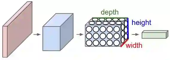 因此,卷积网络接收一个普通彩色图像,就像一个矩形盒子,其宽度和高度由沿着这些维度的像素数量来测量,深度为三层,RGB中每个字母对应一层。这些深度层被称为通道。